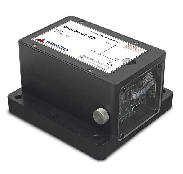 The Shock101-EB is a high speed, battery powered, stand alone tri-axial, shock data logger, typically offering a 60 day battery life. Continuously sampling at 512Hz, this data logger writes the peak acceleration (g force) to memory at the user-specified reading interval.