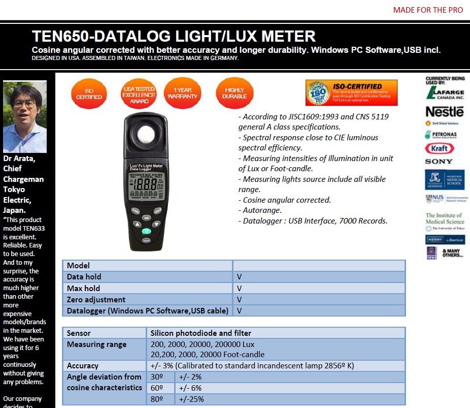 Featured item TEN650-Datalogging Light Meter with windows PC analysis software