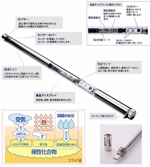 Introducing a frying oil monitor that can be used to periodically check and monitor the quality of oil. This instrument is capable of measuring both TPM (Total Polar Materials), a standard used in Europe as an indicator of the overall quality of frying oil, as well as AV (Acid Value), which indicates changes in cooking oil properties.