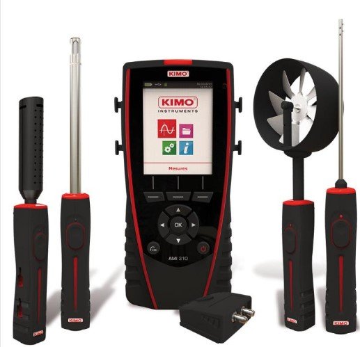 Kimo’s AMI 310 measures simultaneous parameters including pressure, temperature (Pt100 and thermocouple), humidity, air quality (CO/CO2), air velocity, airflow (vane probes and hotwire), and tachometry.