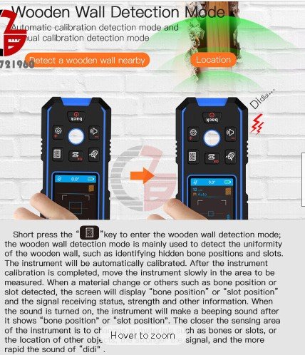 Selling point: 1. This product quickly and easily locates wood metal studs, joists, metal pipe rebar and live AC wires behind walls, floors and ceilings. 2. The design of the alarm allows you to know the situation of the wall at all times, making the operation more accurate. 3. This wall detector can clearly identify what objects are inside the wall, which is more intuitive and accurate. Wood detection, metal detection, electric current detection. 4. A wide range of adaptations, as long as you want to view the interior of opaque objects, you can use it. 5. Use upgraded internal sensors. It senses changes in the density of the space behind the wall and can locate the stud center very accurately.
